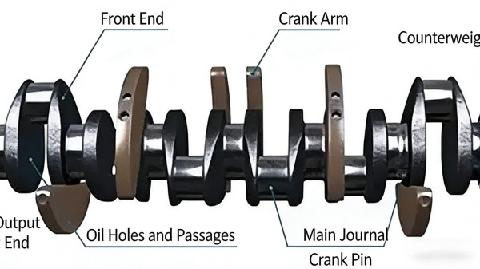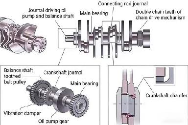 The crankshaft receives forces from the connecting rod, converts the reciprocating motion of the piston into the rotational motion of the crankshaft, and outputs it.