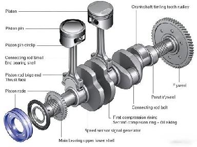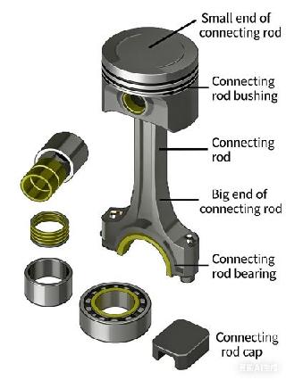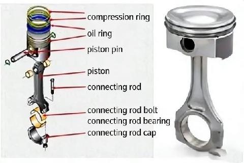 The piston and connecting rod assembly primarily consists of the piston, piston rings, piston pin, connecting rod, connecting rod bearing shells, and connecting rod cap.